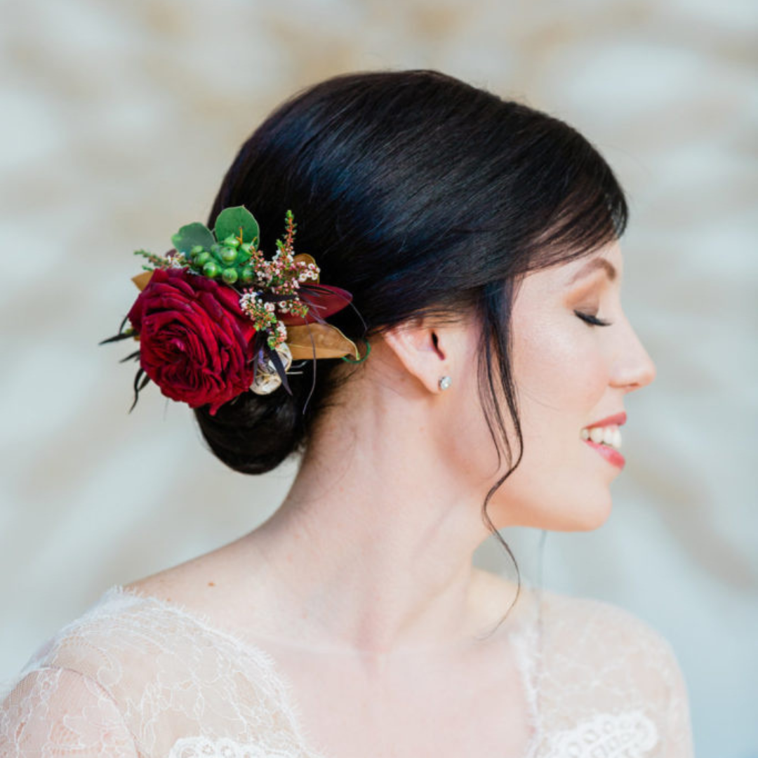 The added addition of hair jewels in your hair or a stunning flower creation as Steff has on your wedding day, looks amazing. You must ensure there is a way to secure that is easy to put in and will last the day.